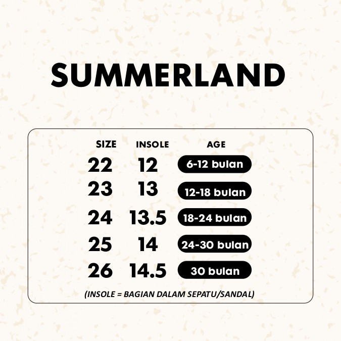 SANDAL SUMMERLAND NEW JEANS^^ Sandal simple yang membuat si baby makin lucu dan menggemaskan krn ada bunyinya saat dikenakan ^^Tersedia banyak varian warna yang pasti membuat penampilan si baby makin menarik^^ Sangat ringan dan nyaman dipakai^^ Rekomendasi usia : usia 6-12 Bulan rekomendasi size 22/23 usia 12-18 Bulan rekomendasi size 23/24 usia 18-24 Bulan rekomendasi size 24/25 usia 24-30 Bulan rekomendasi size 2/26 berikut untuk detal sizenya :) size 22 insole 12 cm size 23 insole 13cm size 24 insole 13,5 cm size 25 insole 14 cm size 26 insole 14,5 cm insole = panjang dlm sandal Tolerir Size +-0,5 - 1cm ^^